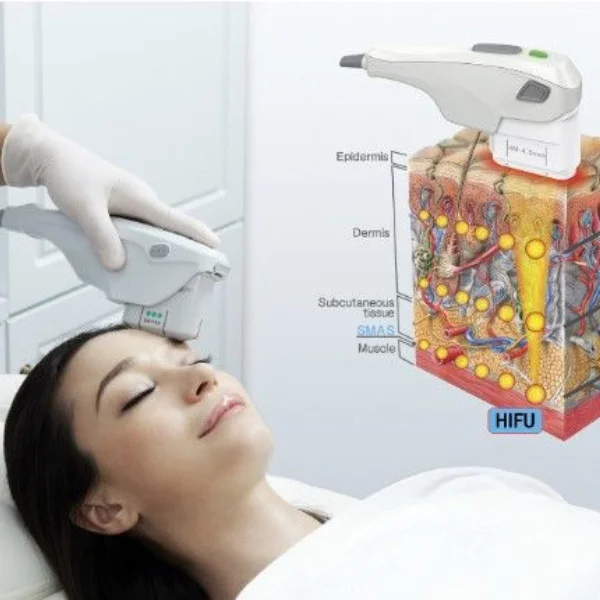 HIFU delivers focused ultrasound energy deep into the skin layers, targeting the SMAS (muscle) layer—the same layer treated in surgical facelifts. This creates a firming and lifting effect over time.